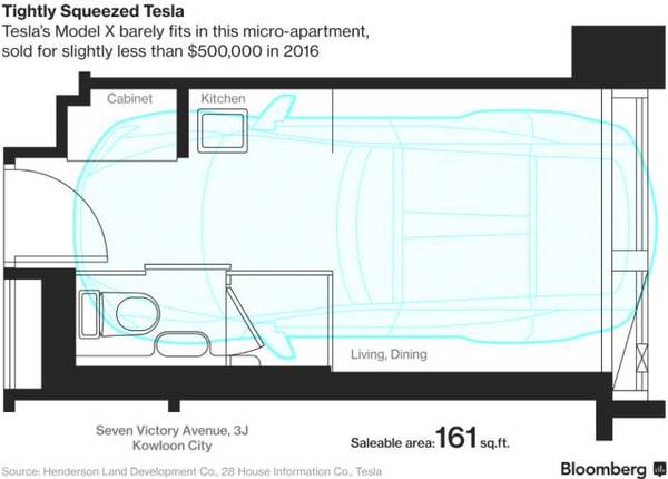 ▲房屋样本间图:161平方英尺的公寓只能勉强停放一辆特斯拉Model X(图片来源:彭博)
