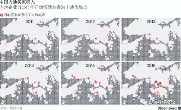 ▲涌入香港楼市的内地资金逐年增加(图片来源:彭博)